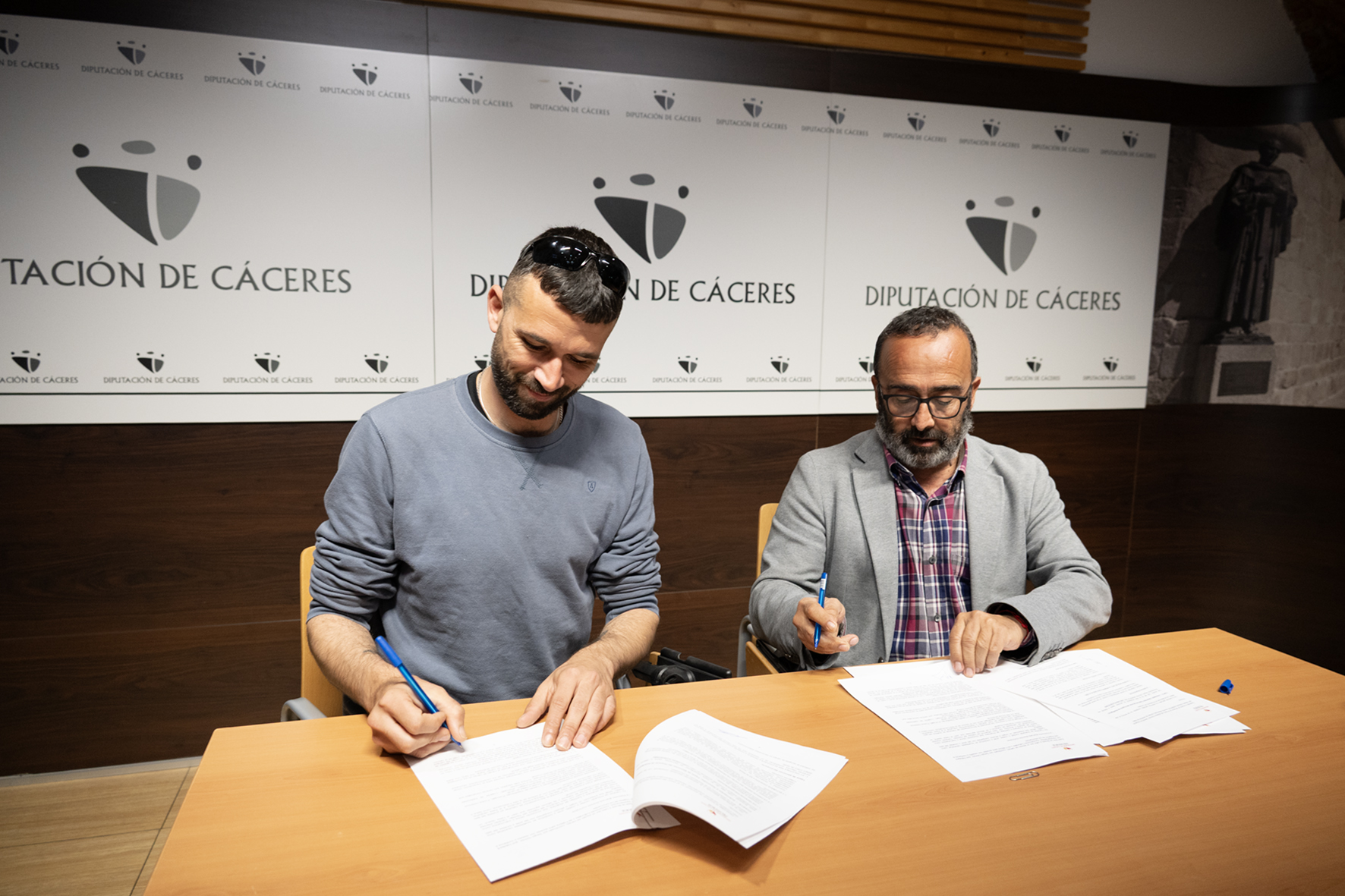 30/03/2026.-  Documentar y revitalizar el folclore y la tradición oral más desconocida de la provincia de Cáceres, ahondar en los lazos de unión y el intercambio cultural en los pueblos rayanos, conectar la tradición con la juventud como forma de respetar contextos culturales sociales y lingüísticos…todo esto y mucho más es el proyecto “¡Canta Puebru!, Canta”, que hoy echa a andar con la firma de un Protocolo de Colaboración entre la Diputación Provincial de Cáceres y el artista Sergio Gómez, “El Gato con Jotas”.