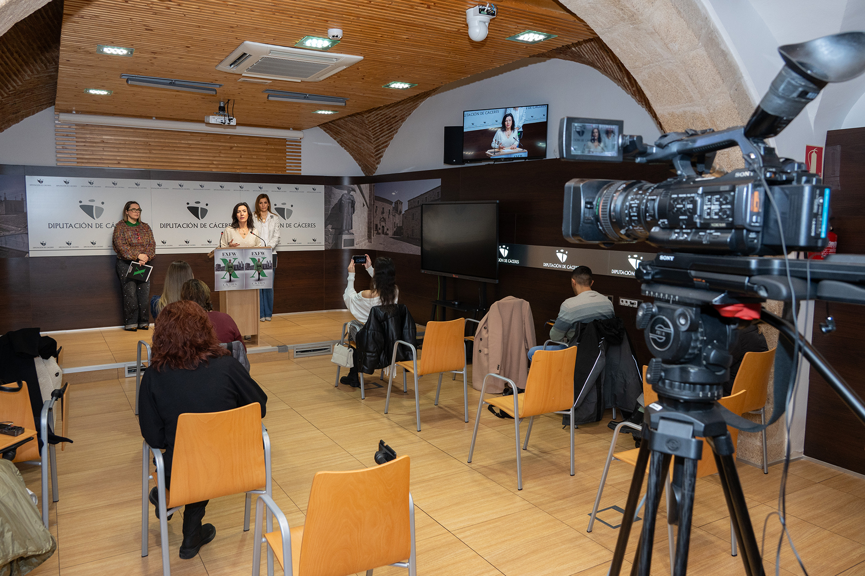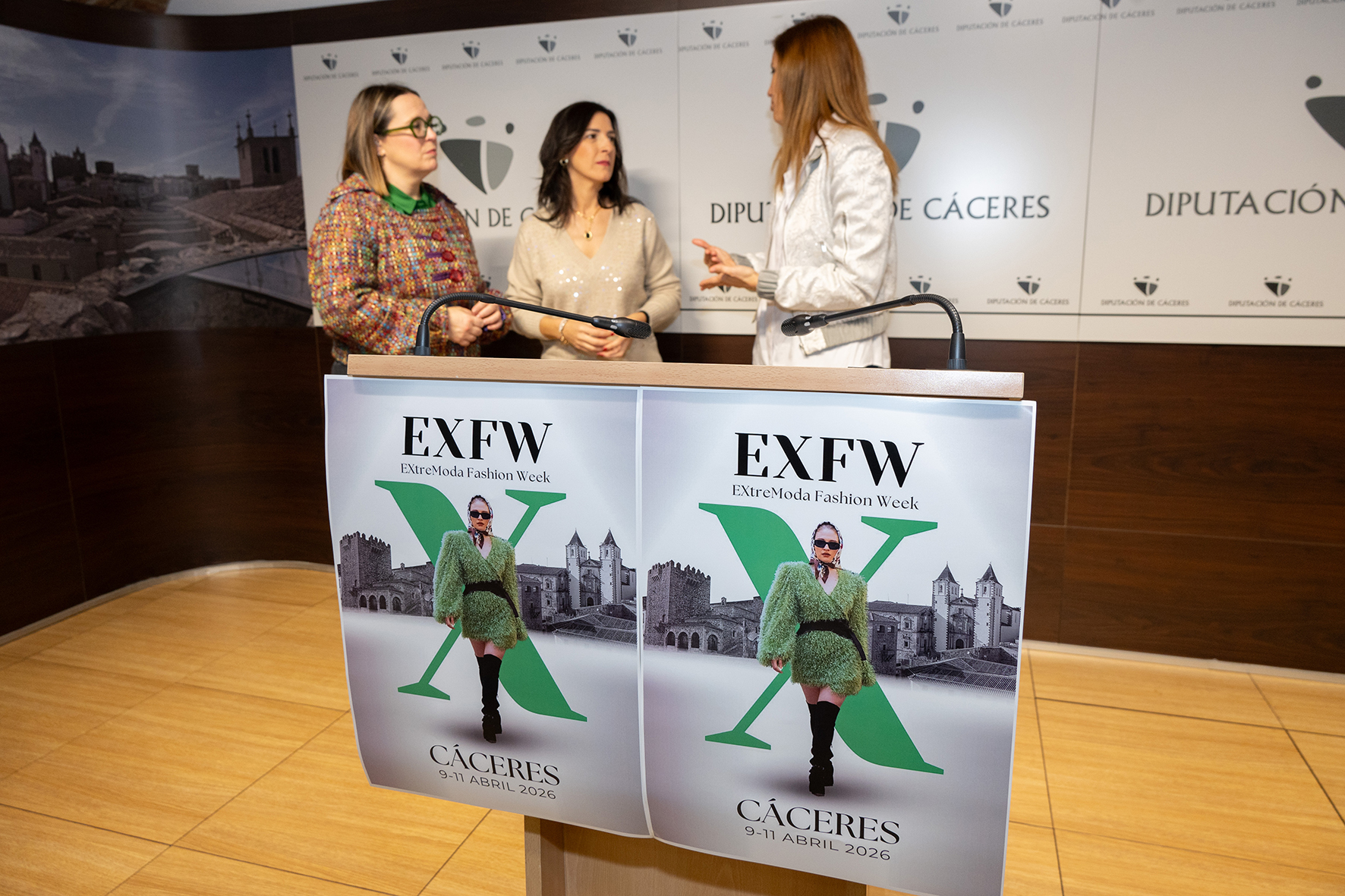04/02/2026, Cáceres.- La vicepresidenta primera de Territorio, Igualdad y Cultura de la Diputación de Cáceres, Esther Gutiérrez, ha presentado este martes la segunda edición de EXtreModa Fashion Week, junto con las promotoras del evento, Rosa Romero y Eva Tejeda, y ha destacado la importancia de la moda como sector cultural, creativo y económico estratégico para la provincia y para Extremadura.