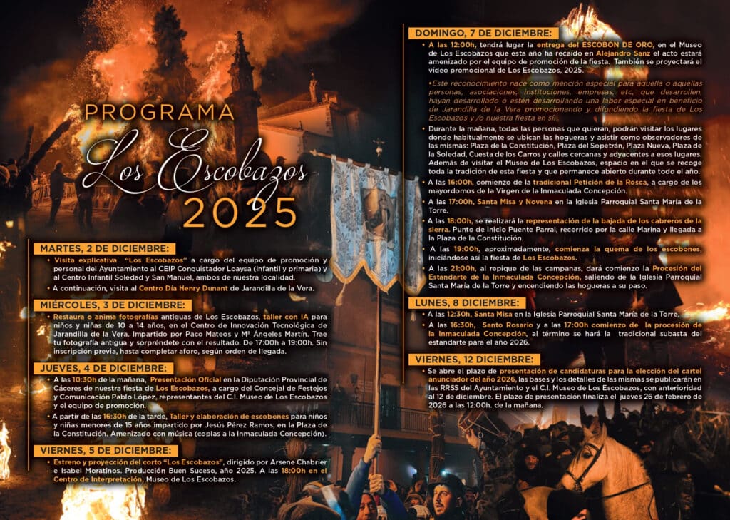 Además, Jarandilla ya viene trabajando en días previos, tal como ha destacado Pablo Miguel López, con visitas a colegios transmitiendo la tradición y la historia, realizando talleres de restauración de fotografías o elaboración de escobones, así como el estreno y la proyección del corto “Los Escobazos”, dirigido por Aresene Chabrier e Isabel Moratinos, que podrá verse en el Centro de Interpretación este viernes 5, a las 18:00 horas.