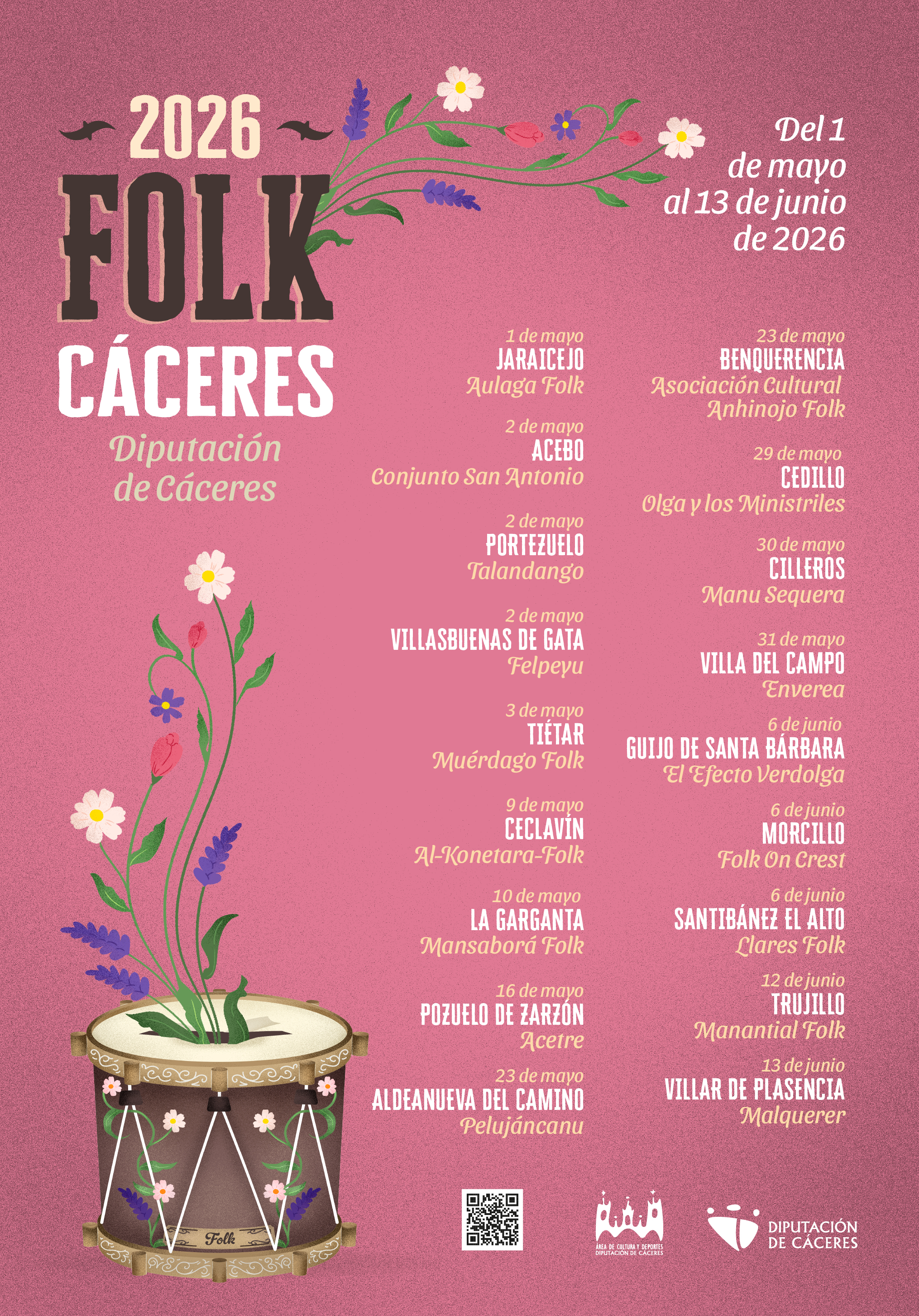 17/04/2026.- La música de raíz vuelve a tomar las calles y espacios públicos de los municipios de la provincia de Cáceres en la sexta edición del programa cultural Folk Cáceres, que, en esta oportunidad, aterrizará en 18 municipios entre el 1 de mayo y el 13 de junio.