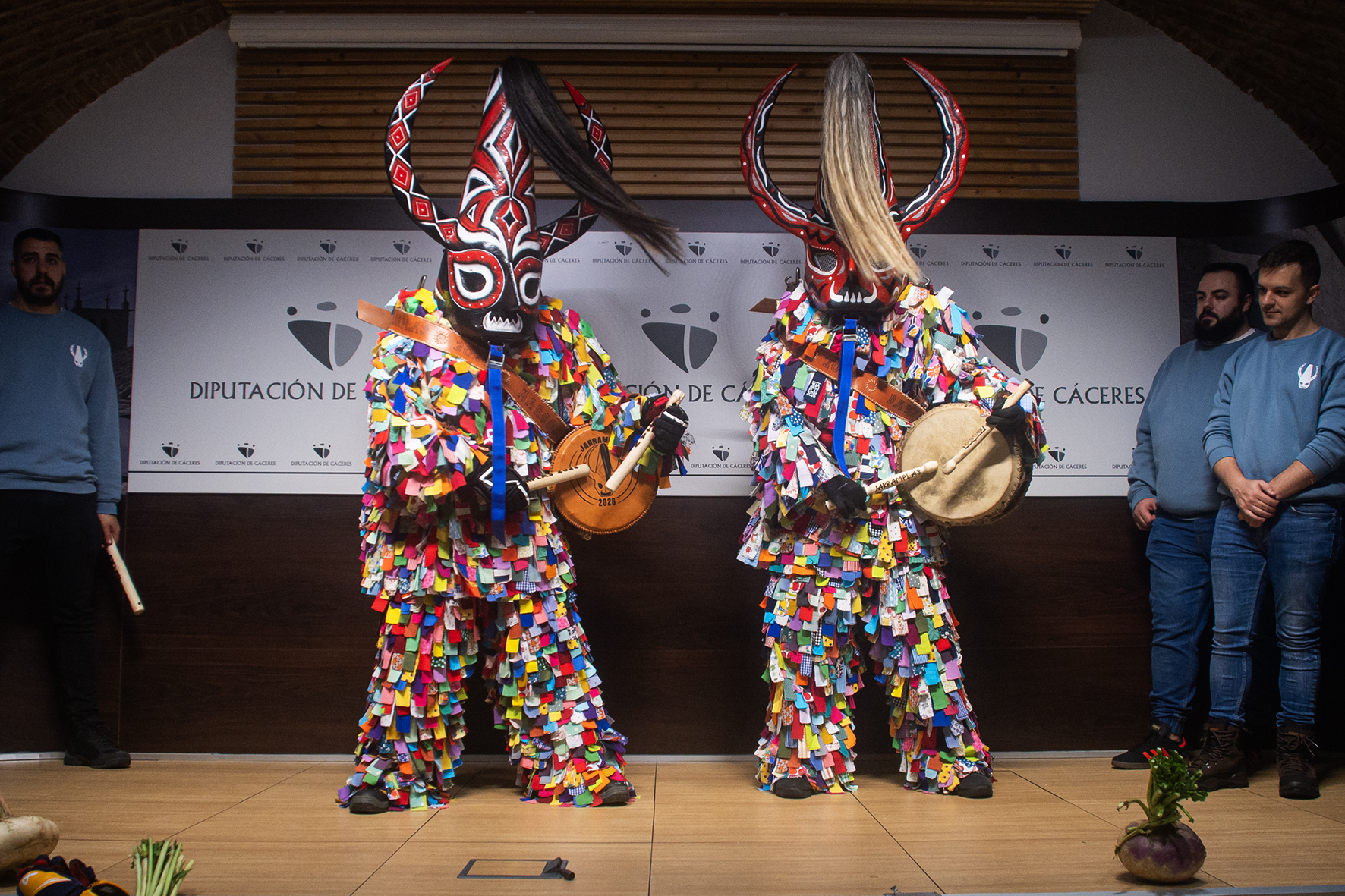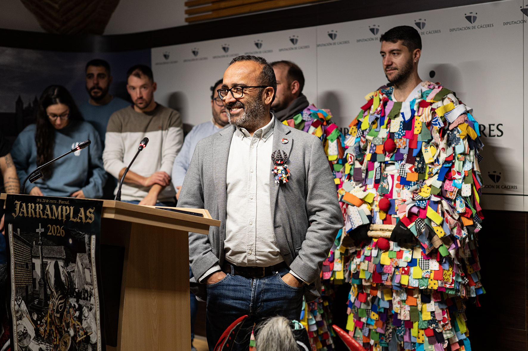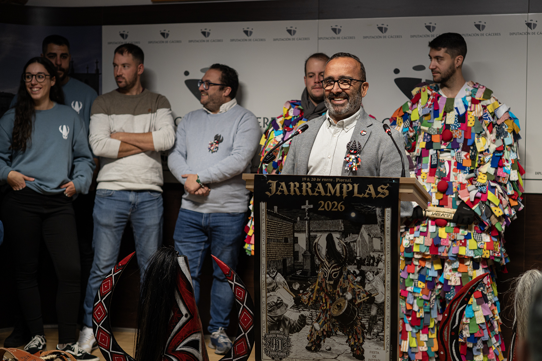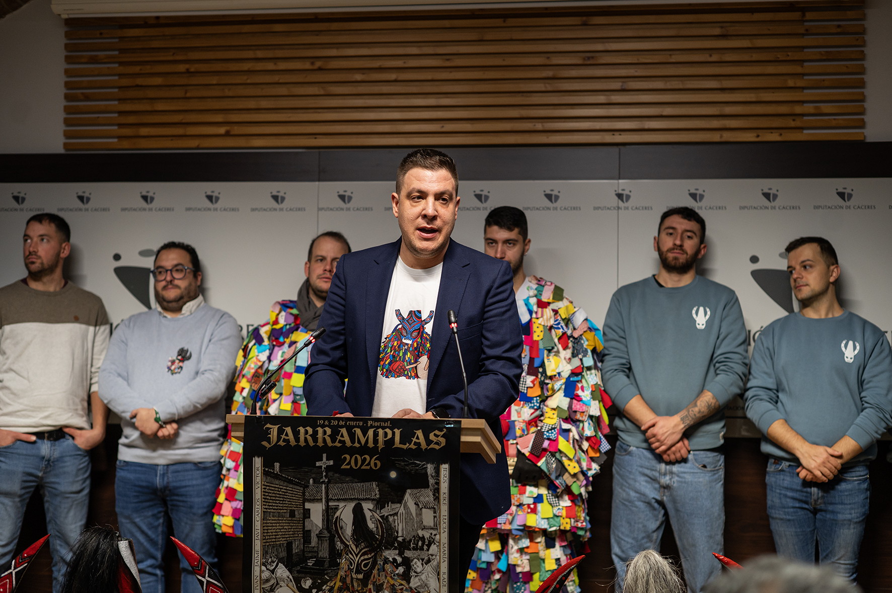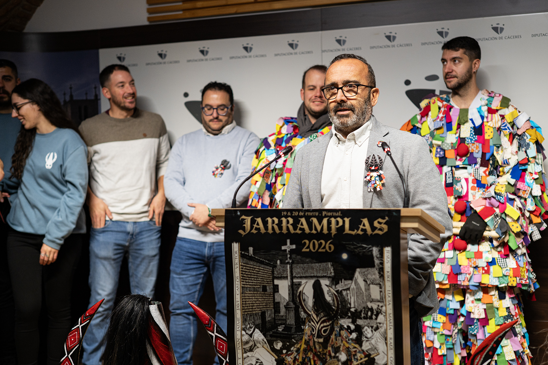 13-01-2026.- Jarramplas 2026, que tiene su cita inamovible en el calendario los días 19 y 20 de enero, se ha presentado en la Diputación Provincial de Cáceres. Mayordomos, Jarramplas, concejales y concejalas junto con el alcalde Javier Prieto y el presidente de la Diputación de Cáceres, Miguel Ángel Morales, han llenado el escenario donde ha quedado reflejado no solo el color de las cintas de los trajes (algunas cargadas de recuerdos muy personales), la autenticidad de sus enormes máscaras, y el sonido de sus tamboriles, sino que también se ha podido ver que se trata de una Fiesta, como ha señalado el Presidente de la Diputación , que es la “representación del poder colectivo y popular”.
