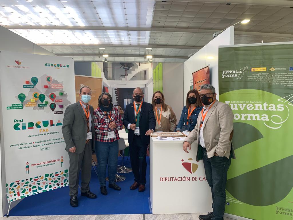 En el stand de la Diputación Provincial de Cáceres se informa de la Red de Circular Fab, del proyecto formativo Isla IV o del programa Juventas, proyectos tanto del área de Innovación y Provincia Digital como del área de Reto Demográfico, Desarrollo Sostenible, Juventud y Turismo, con personal técnico de ambas áreas de trabajo de la Diputación cacereña.