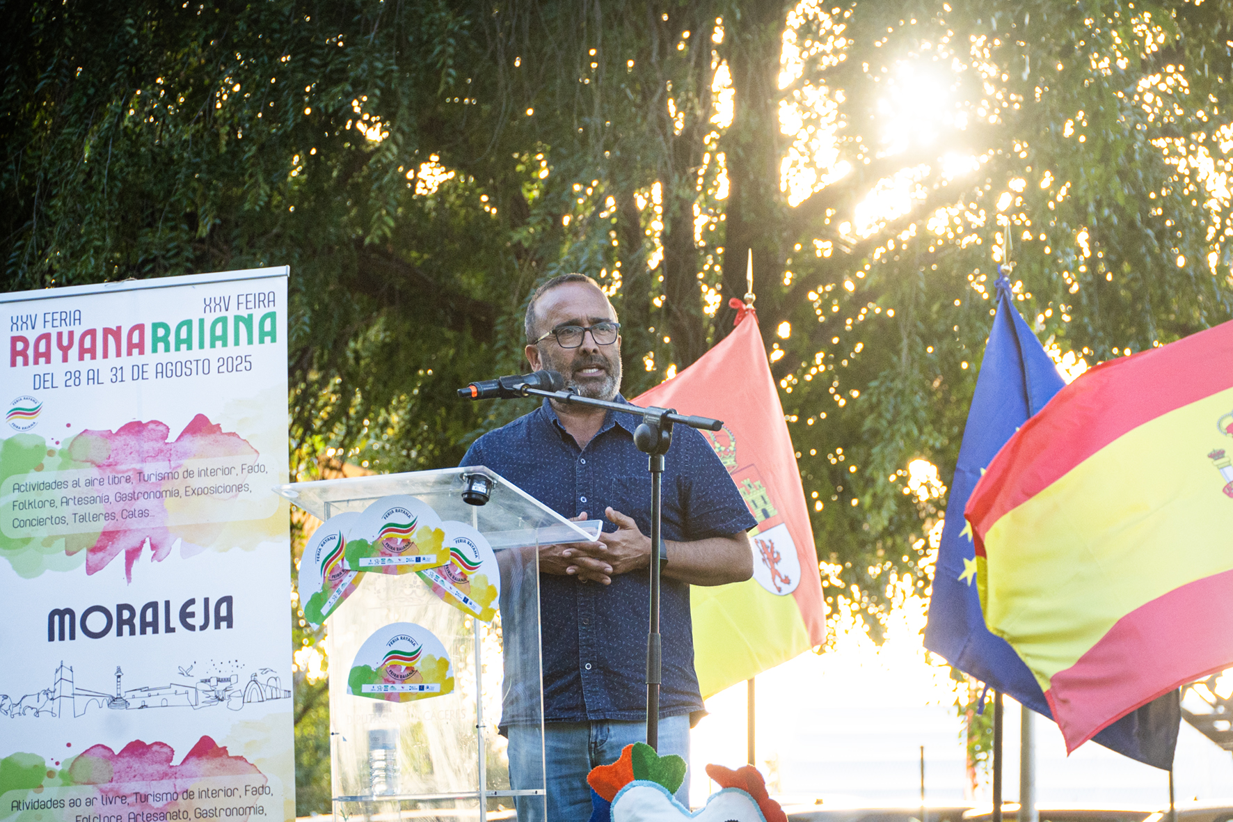 Veinticinco ediciones ya de esta feria que quiere ser un escaparate de todo lo bueno que compartimos. En esta frontera que no existe. En los tiempos que vivimos donde miles de personas mueren de hambre en medio de una guerra por esas líneas que dividen y destruyen… se me va la cabeza a esas imágenes de Gaza o de Ucrania … queremos regalar al mundo, a la comunidad, el ejemplo de que otro modelo de convivencia es posible. Estamos unidos por un hilo que nos une y nos fortalece. Eso son las fronteras. Portugueses y españoles pertenecemos a un territorio compartido donde tenemos la suerte de vivir. Nuestras lenguas comparten palabras. Nuestras comidas recuerdan sabores parejos. Nuestro folclore suena a los mismos panderos. Nuestros campos crecen bajo el mismo cielo afortunado por su pureza” dijo Julio César Herrero.